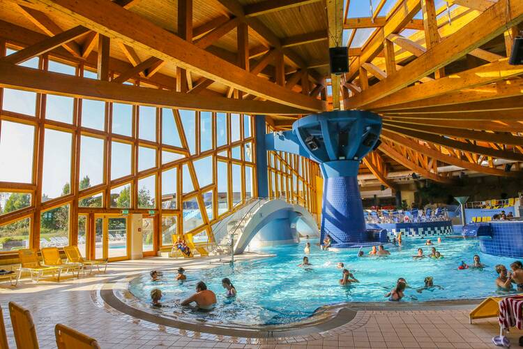 Kleinkindfreundliche Wasserfontänen und Spielzeug gibt es hier ebenso. Ältere Kinder stürzen sich die 120 Meter langen Wasserrutschen hinunter oder lassen sich durch den Strömungskanal treiben. Für die Erwachsenen gibt es einen Wellness- und Saunabereich mit Dampfbädern und Whirlpool, Kamin und Saunagarten.