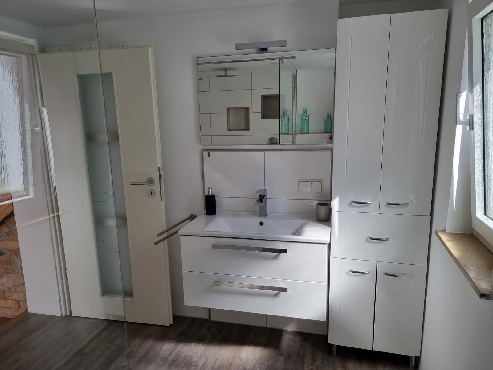 1. OG: kompl. ausgestattete Küche mit Eßplatz für 6 Personen, Bad mit barrierefreier großer Dusche, Waschbecken und WC.